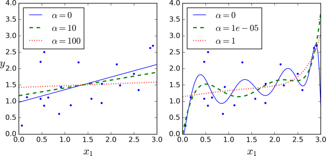 Ridge Regresyonu ( aynı zamanda Tikhonov düzenlileştirmesi olarak da bilinir) doğrusal regresyondaki maliyet fonksiyonumuza (cost function) bir düzenlileştirme terimi eklenmesiyle elde edilir. Bu ekleme ile öğrenme algoritması hem veriyi öğrenir hem de model ağırlıklarını mümkün olduğunca küçük tutmaya çalışır. aşırı-parametresi (hyper-parameter), modeli ne kadar düzenlileştireceğimizi kontrol eder. için Ridge regresyonu, bildiğimiz lineer regresyondur. Eğer çok büyük ise, model ağırlıkları sıfıra çok yakın olacaklardır ve elde edeceğimiz sonuç verinin ortalamasından geçen bir doğru olacaktır.